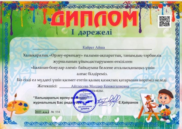«Күн» тобының  тәрбиеленушісі Қайрат Айша Халықаралық «Өрлеу-өркендеу» ғылыми –ақпараттық,        танымдық-тәрбиелік журналының ұйымдастыруымен өткізілген « Балапан –бояулар әлемі» байқауына белсене атсалысқаны үшін І дәрежелі Дипломмен марапатталды, тәрбиешісі Айтлесова Молдір Кенжегалиевна .